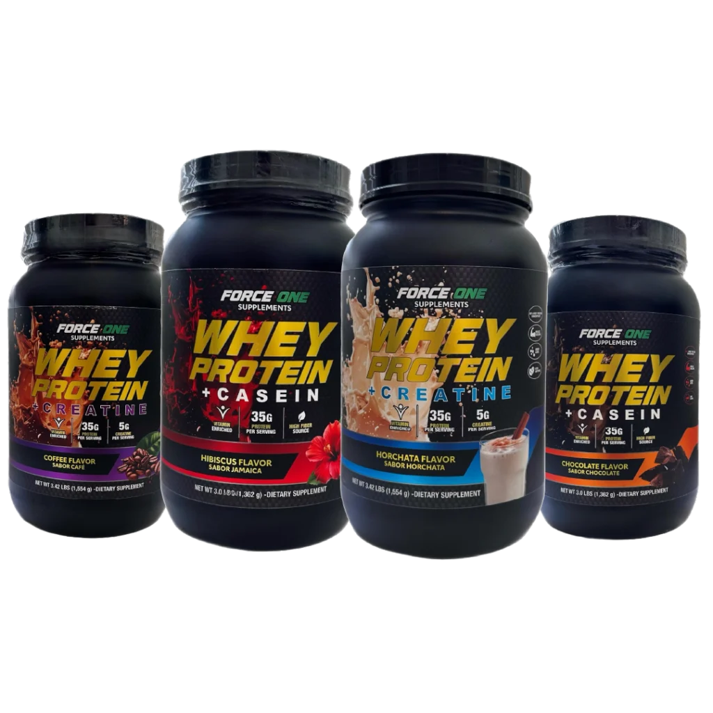 En Force One Supplements encuentras proteínas premium con sabores únicos como Café, Horchata, Chocolate y Jamaica. Fáciles de mezclar, ideales para complementar una alimentación activa y balanceada.